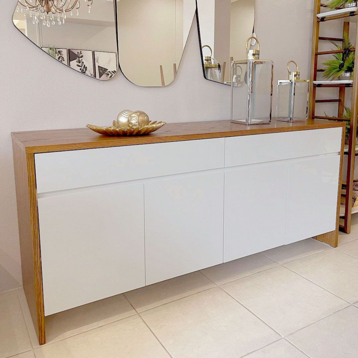 Buffet moderne associant structure en bois naturel et façades blanches lisses, avec tiroirs supérieurs et rangements fermés. Un mélange élégant et intemporel pour un intérieur contemporain.