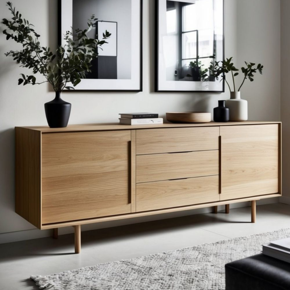 Élégant buffet au design scandinave, en bois clair naturel, doté de deux portes et trois tiroirs centraux. Idéal pour un salon moderne, il allie rangement pratique et style épuré.