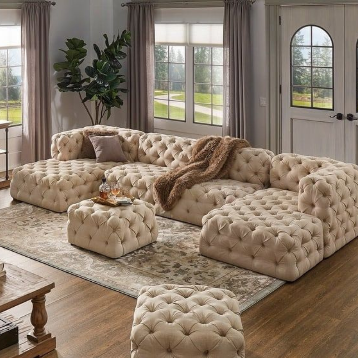 Élégant et raffiné, ce canapé d’angle capitonné beige apporte une touche de luxe intemporel à votre intérieur. Son revêtement doux et ses assises généreusement rembourrées garantissent un confort optimal. Les détails tuftés, associés à sa conception modulable, créent un style sophistiqué qui s’intègre parfaitement dans un salon chic et chaleureux. Idéal pour se détendre ou recevoir vos invités avec élégance.