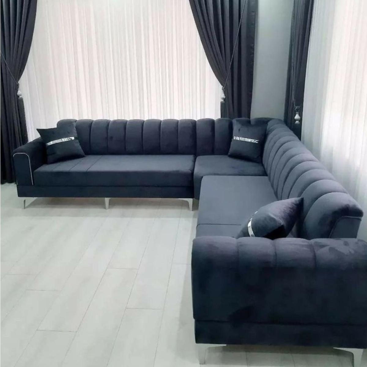 Élégant et spacieux, ce canapé d’angle en velours noir allie confort et modernité. Avec son design raffiné, ses lignes épurées et ses coussins assortis, il s’intègre parfaitement à tout type de salon. Idéal pour recevoir ou se détendre, il apporte une touche de luxe et de convivialité à votre intérieur.