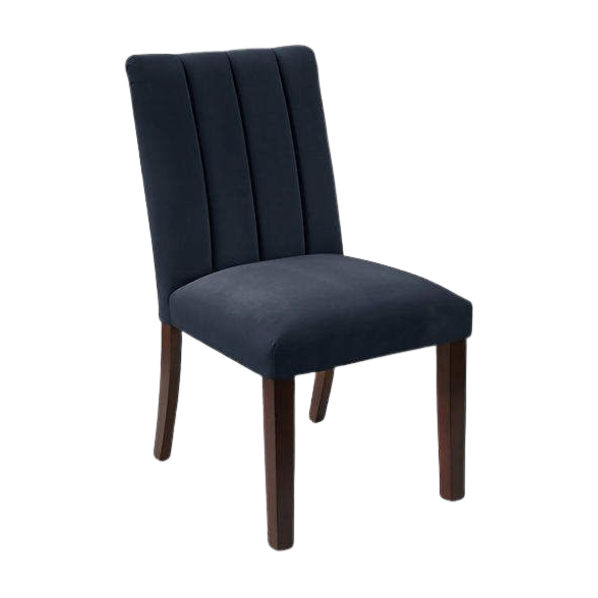 Élégante et confortable, cette chaise en velours bleu nuit se distingue par son dossier capitonné à coutures verticales. Ses pieds en bois foncé ajoutent une touche chaleureuse et raffinée, idéale pour une salle à manger moderne ou un intérieur sophistiqué.