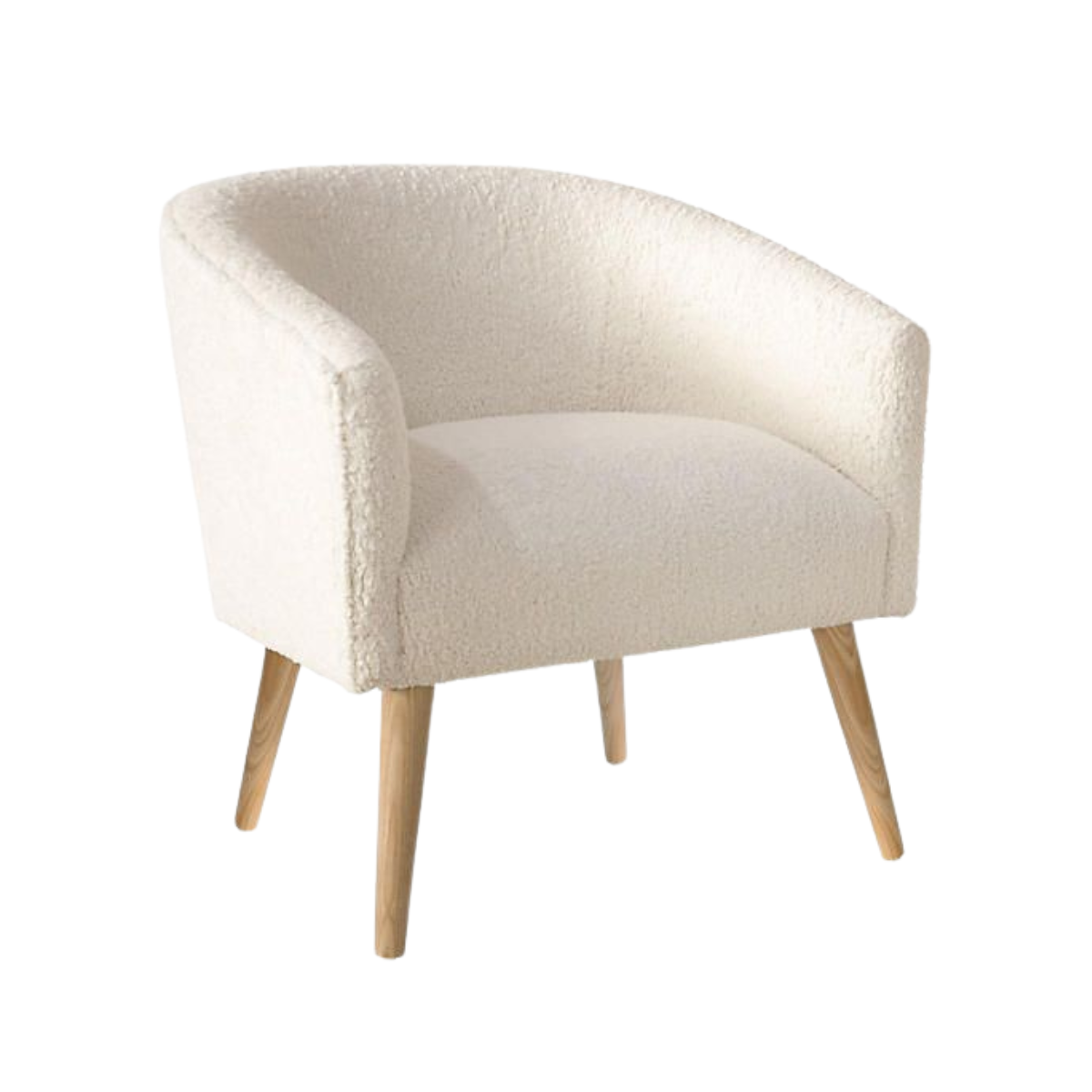 Ce fauteuil élégant au revêtement en bouclette douce apporte confort et modernité à votre intérieur. Son assise accueillante et ses pieds en bois naturel offrent un style scandinave chaleureux, idéal pour le salon ou la chambre.
