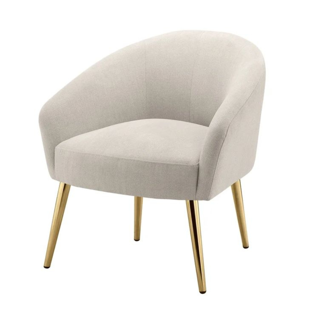 Ce fauteuil au design épuré séduit par son revêtement en tissu beige et ses pieds dorés élancés. Confortable et raffiné, il apporte une touche contemporaine à tout intérieur, du salon au bureau.