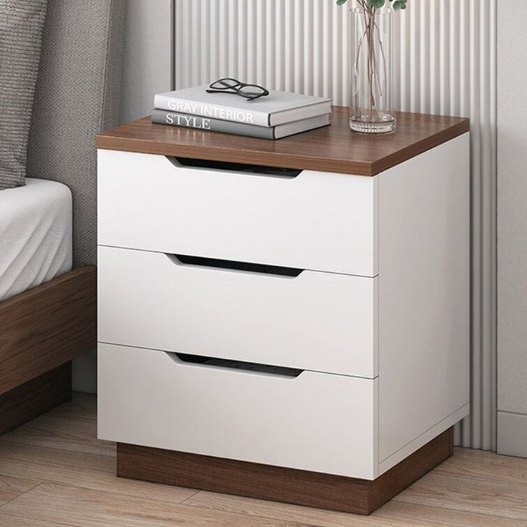 Table de chevet moderne bois et blanc – 3 tiroirs